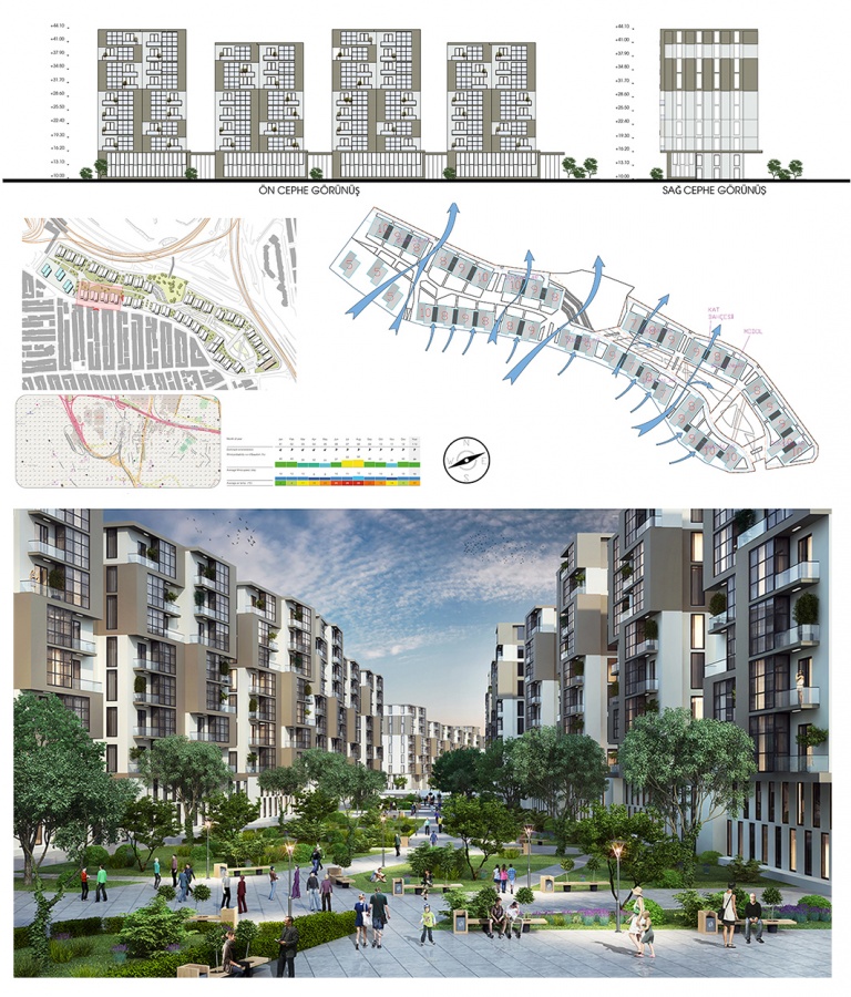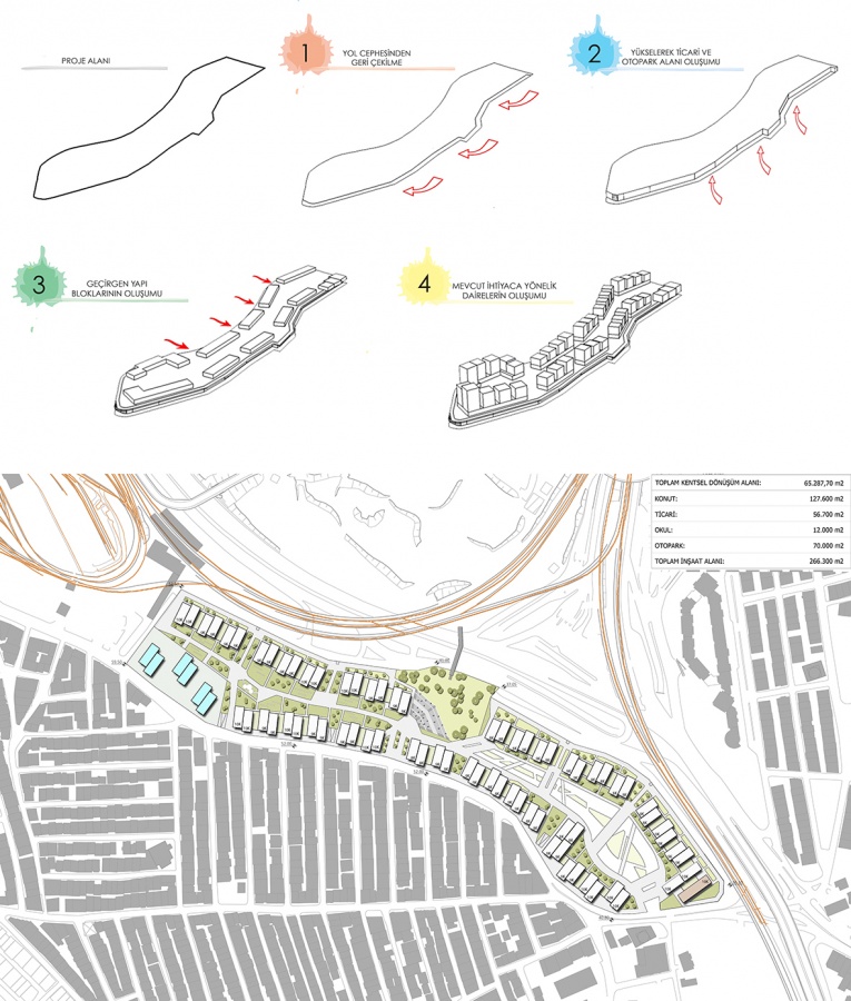 Kentsel dönüşümün tek başına mahalle sakinleri veya İBB tarafından yapılması ciddi bir maliyet oluşturmaktadır. Tasarımda bu maliyetler de göz önünde bulundurularak projenin ekonomik geri dönüşümüne katkı sağlayacak kentsel dönüşümün sürdürülebilir ve daha geniş alanlara yayılmasına imkan verecek çalışmalar projemize yansıtılmaya çalışılmıştır. Arazinin oturumunda hakim rüzgar yönü düşünülerek yapılar konumlandırılmıştır.