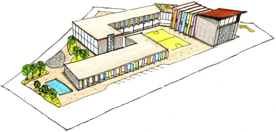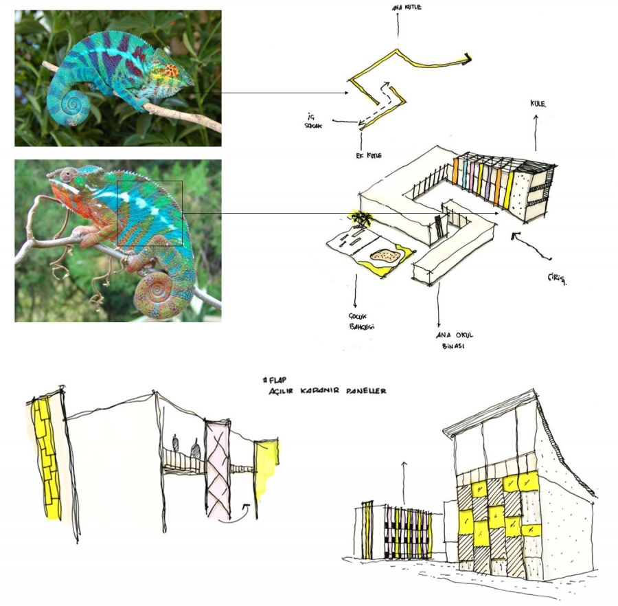 Yapının kütlesi bukalemundan esinlenilmiş olup "baş, gövde ve kuyruk" olmak üzere 3 bölüme ayrılmıştır. Baş kısmına doğru yükselen kütleler, yapı sürekliliğini arttırmayı hedeflemektedir. Aynı zamanda bukalemunun renkli derisi, okulun hem kendi iç ve dış mekanlarına hem de çevresine zenginlik katmak için renkli paneller olarak projeye yansımıştır.